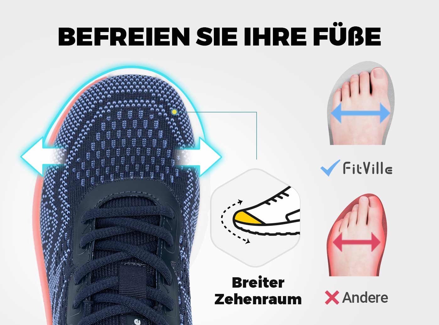 Der geräumige Zehenraum bietet ausreichend Platz für die Zehen, um sich frei auszubreiten & natürlich zu leben.