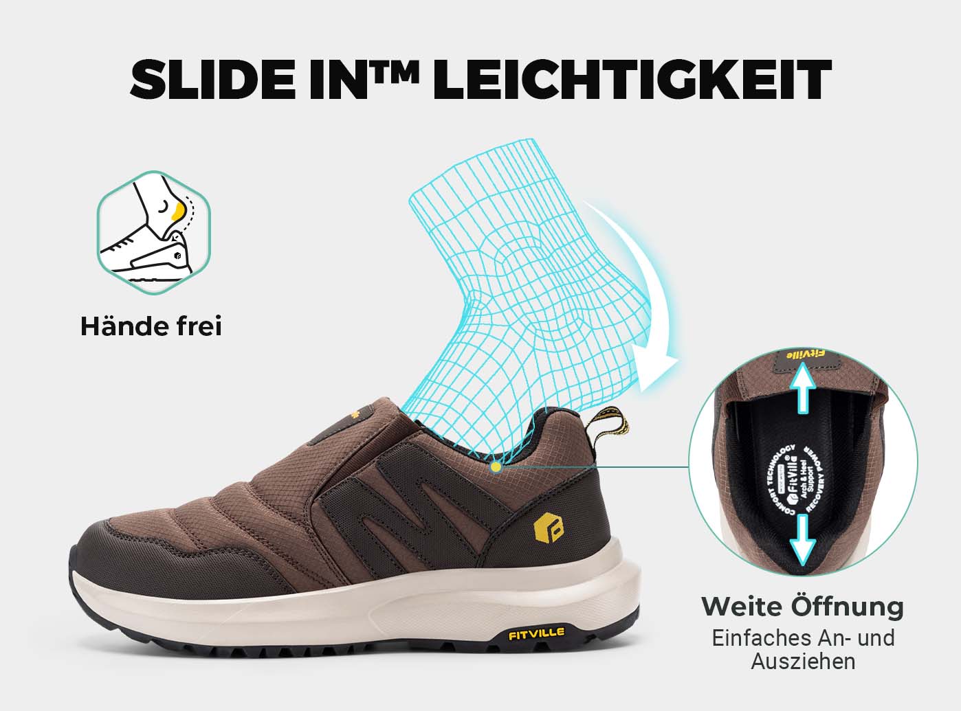 Die FitVille Men's Explorer Outdoor Slip-On Shoes V2 sind ideal für urbane Entdecker und leichte Wanderer und sorgen für mühelose Ausflüge. Ihr elastischer Doppelkern sorgt für eine bequeme, sockenähnliche Passform und passt sich hohen Fußgewölben und geschwollenen Füßen mit zusätzlicher Tiefe an.